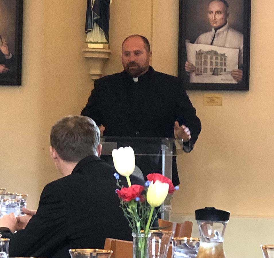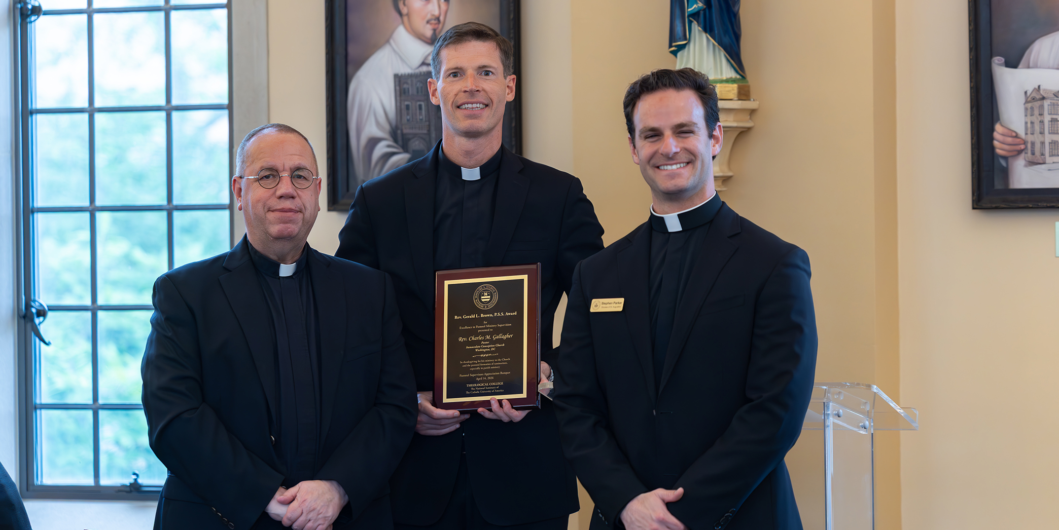 An exemplar of the qualities of a superior pastoral formator, Father Charles Gallagher, pastor of Immaculate Conception Church in Washington, D.C., accepted the Rev. Gerald L. Brown, P.S.S., Award for Excellence in Pastoral Ministry Supervision. A priest for 16 years, he recalled that from his childhood he had great admiration for and eventual aspiration toward diocesan parish ministry, inspired by his first pastor, Father Rick Gancayco in Hyattsville. His love for parish work has only grown with the years, some of which he has shared with TC seminarians in teaching pastoral homiletics and in hosting them for ministry assignments at Immaculate Conception.